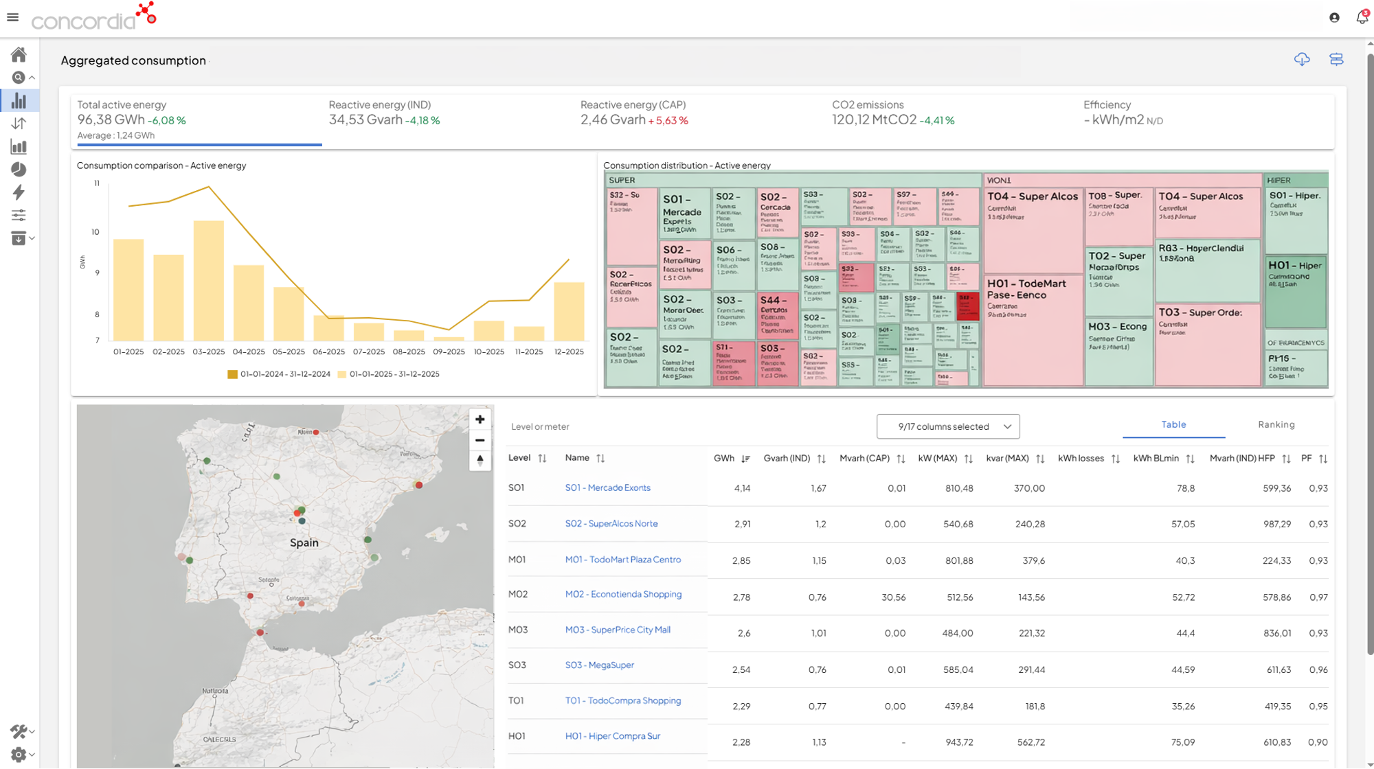 Concordia Energy provides a comprehensive view of energy consumption at both meter and load level, combining key indicators, time-series analysis, and advanced visualizations within a single dashboard. In addition to total consumption, peak and off-peak usage, reactive energy ratios, power factor, and maximum demand, the platform enables detailed submetering analysis by energy subtype.
