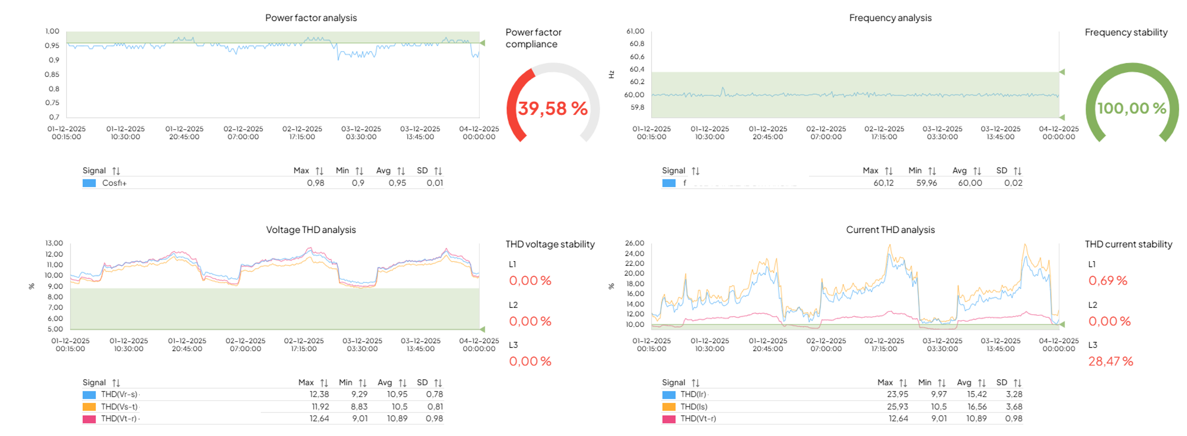 Dedicated visualizations enable detailed assessment of power factor compliance, frequency stability, voltage unbalance, and total harmonic distortion (THD) for both voltage and current across all phases. Aggregated quality scores, trend analysis, and threshold-based indicators allow energy managers to quickly identify deviations, assess compliance with standards, and detect potential risks to equipment, processes, and energy efficiency.