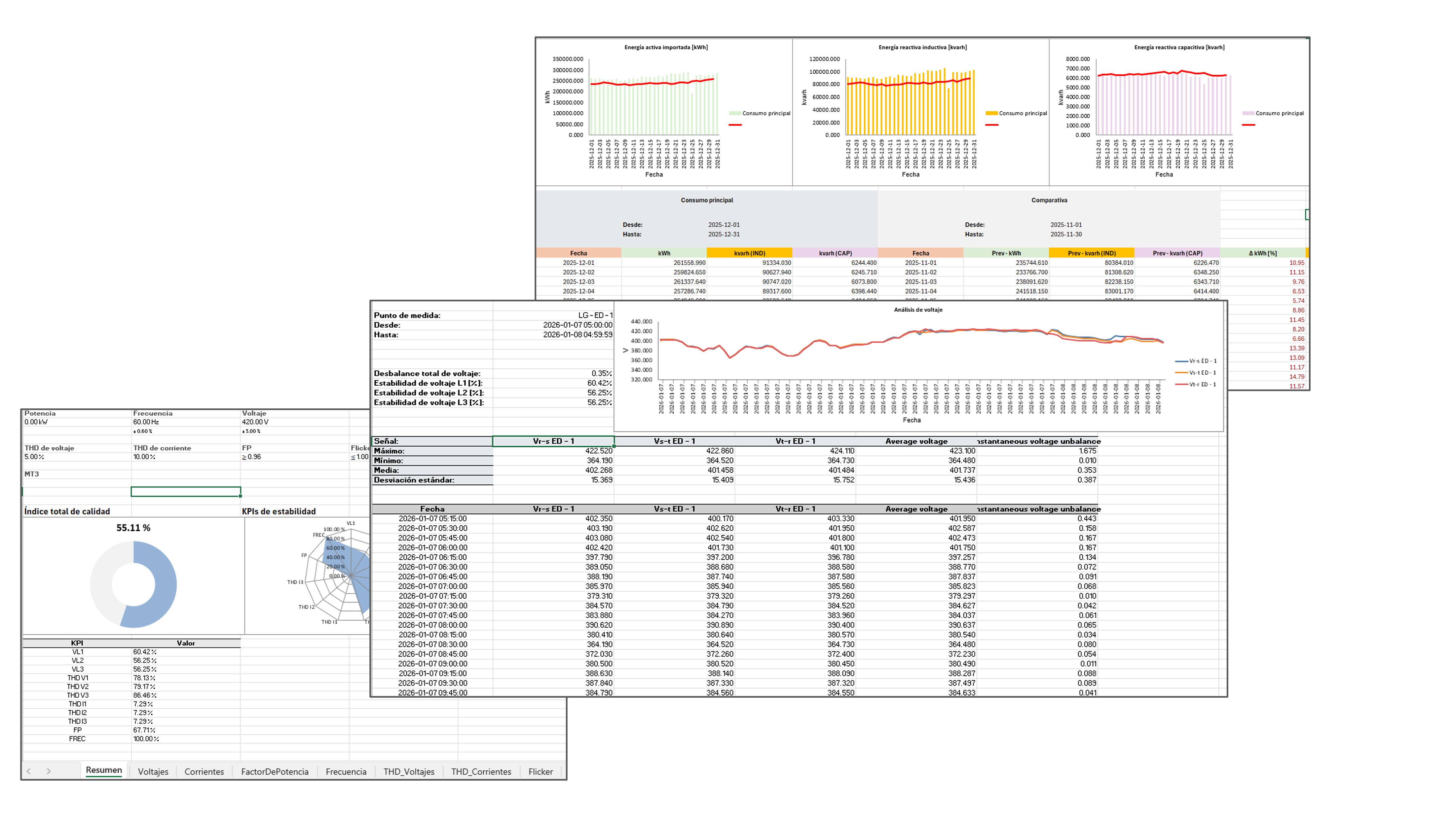 Concordia Energy provides comprehensive power quality monitoring by continuously analyzing electrical parameters such as voltage, frequency, power factor, and harmonic distortion. Key quality indicators are evaluated in real time and over historical periods, offering a complete view of network stability and electrical performance.