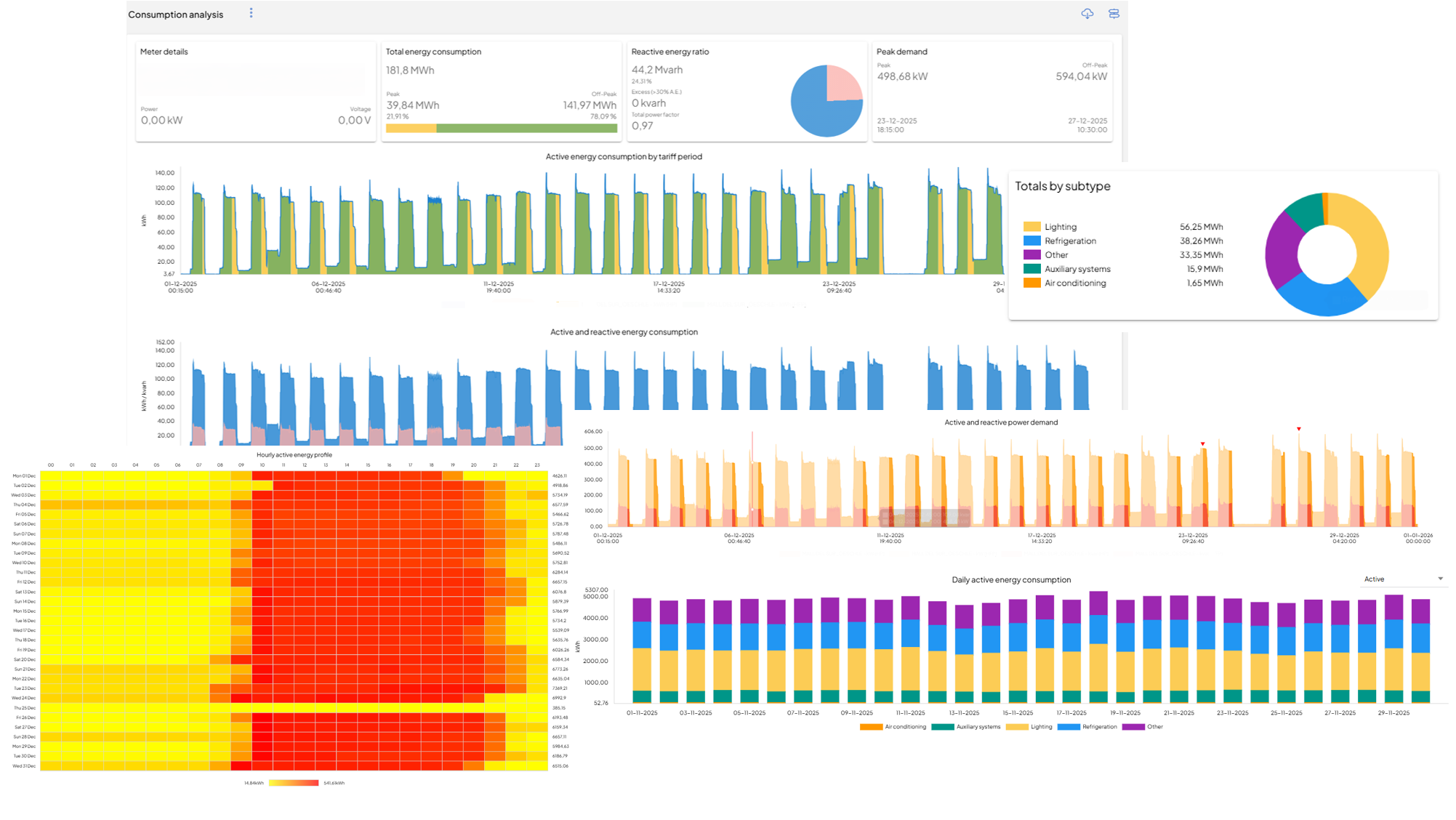 Consumption can be broken down by load categories such as lighting, refrigeration, air conditioning, auxiliary systems, or residual loads, revealing how energy is distributed across end uses. Detailed charts expose consumption patterns over time, correlate active and reactive behavior, and highlight daily trends and hourly profiles through intuitive heatmaps. This level of granularity allows energy managers to pinpoint inefficiencies, validate operational strategies, and prioritize optimization actions based on the actual sources of energy consumption.